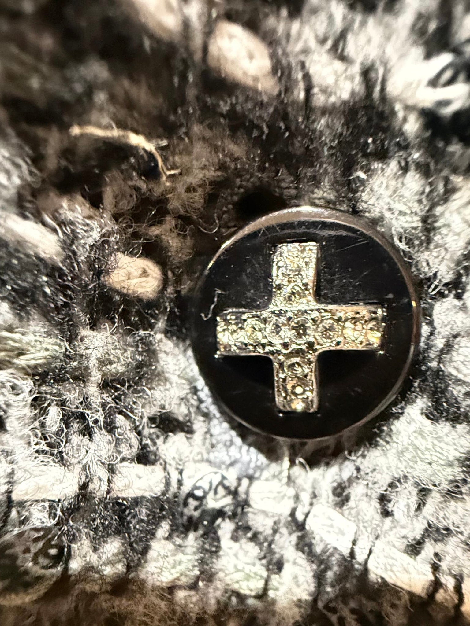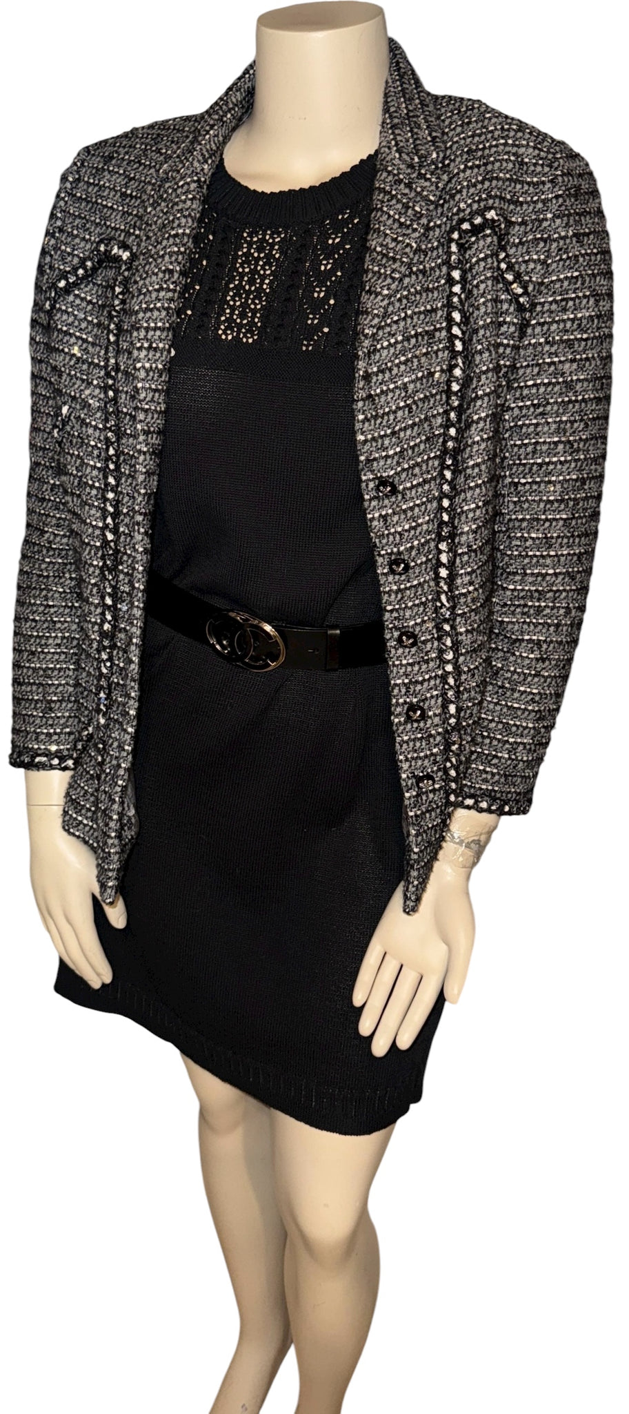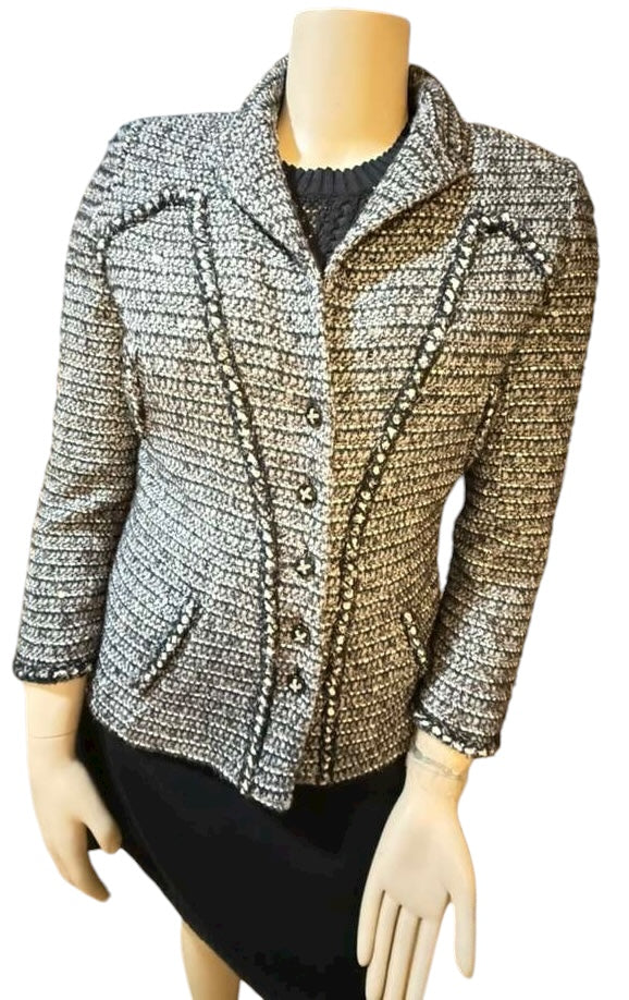 Tweed Gray and Black Jacket from Chanel's famous 06A, 2006 Fall collection. This is a medium weight jacket. Fully lined. It has 11 Chanel buttons, black with a crystal "X" in the center, 3 on each sleeve plus 5 on the front for closure. The fabric is made up of yarns in black, white, and gray with sequins randomly spaced and in geometric designs.