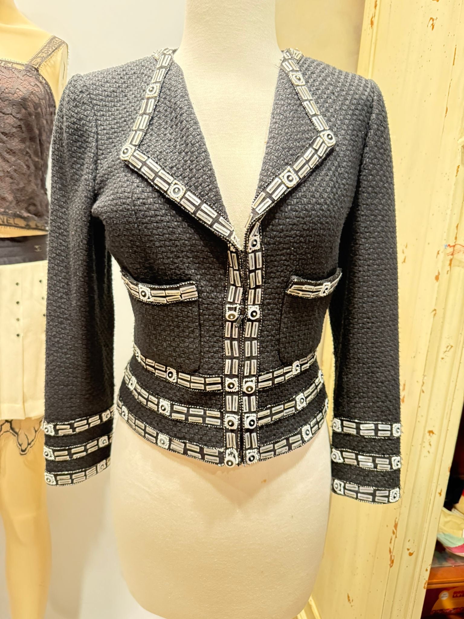 This fabulous jacket is from Chanels famous 03P 2003 Spring collection, and has never been worn. Flattering, with amazing 2" wide trim of beads, Mother of pearl, and sequins in a geometric design, fitted as well, with zippers at each wrist. Closure-the bottom 7" zips up, From that point up, there are 2 sets of hook and eyes. Shown with a lace Chanel